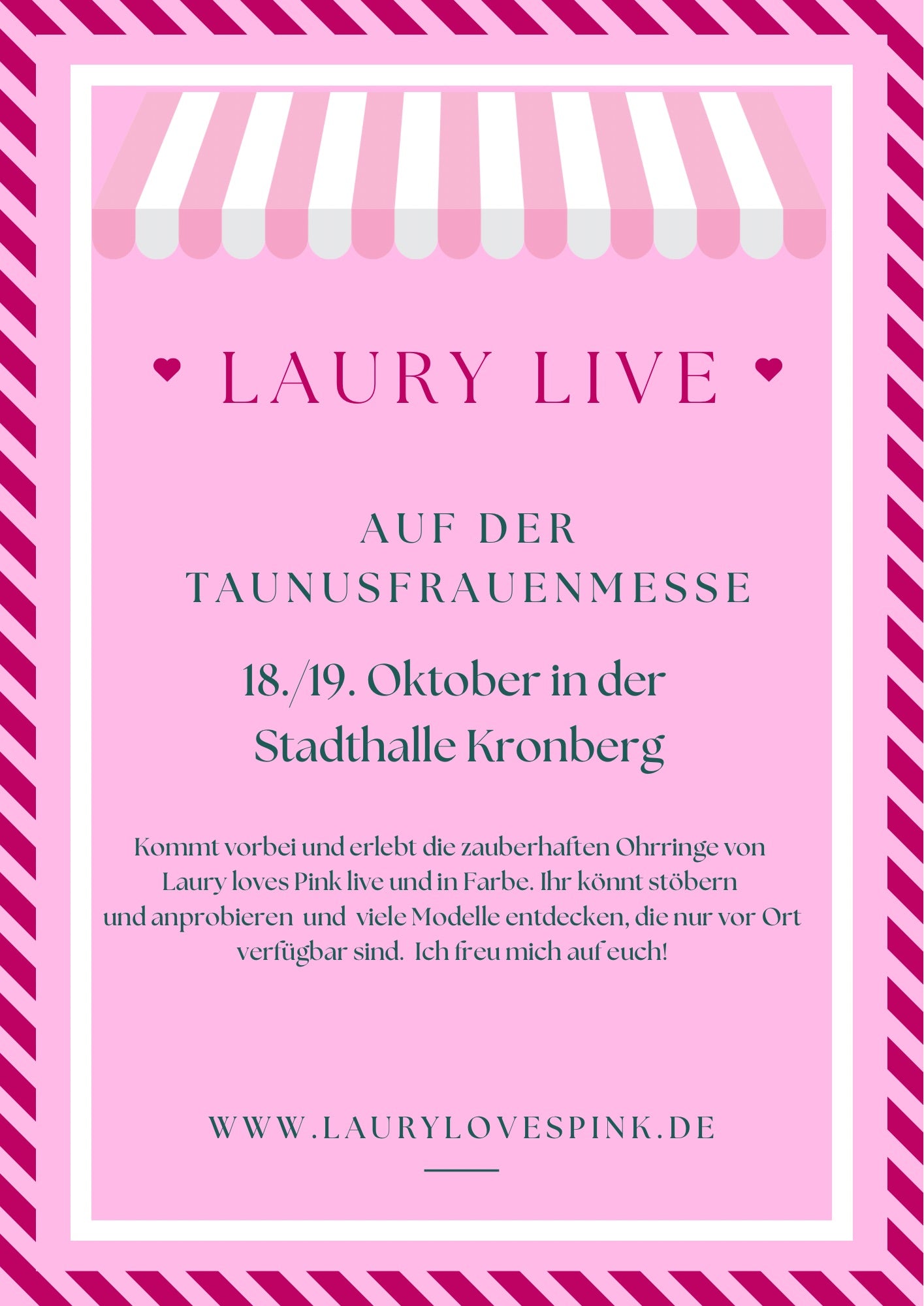 Am 18. und 19. Oktober könnt ihr meine Laurys live auf der Taunusfrauenmesse in der Stadthalle Kronberg erleben. Schaut euch bei dem tollen Angebot vieler großartiger Unternehmerinnen aus dem Raum Frankfurt und Taunus um und versorgt euch dann bei mir mit tollen neuen, nur vor Ort verfügbaren Ohrringen oder Armbändern. Ihr findet mich im Raum Kronthal im UG an Stand 88. Ich freue mich auf euren Besuch!